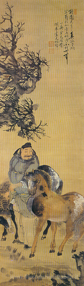 Ti offriamo una riproduzione artigianale su tela dell'opera famosa 'La pittura di un uomo con due cavalli' di Owon, dal Museo delle Riproduzioni.