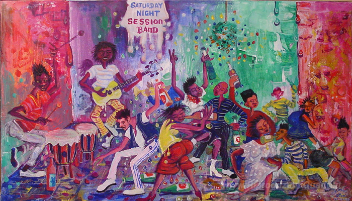 Ti offriamo una riproduzione artigianale su tela dell'opera famosa 'La Sessione Banda Sabato Night' di Nzante Spee, dal Museo delle Riproduzioni.