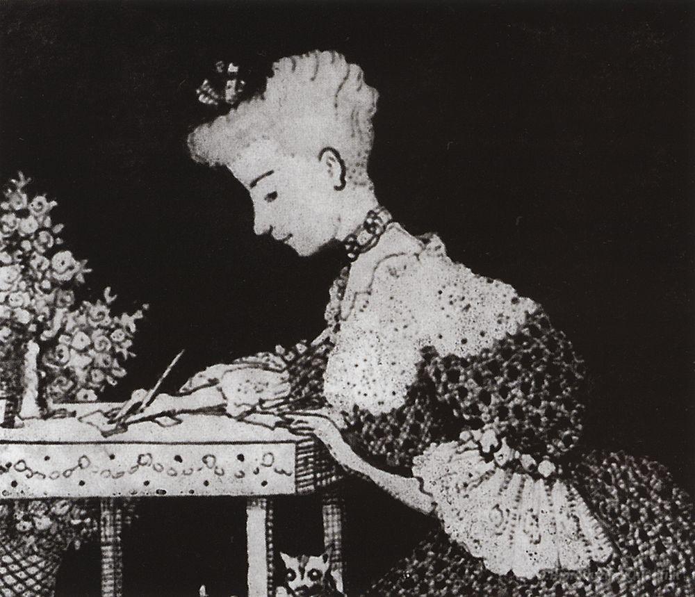 Ti offriamo una riproduzione artigianale su tela dell'opera famosa 'La Signora dietro la scrivania (Anonimo Lettera)' di Konstantin Somov, dal Museo delle Riproduzioni.