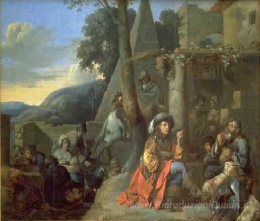 Ti offriamo una riproduzione artigianale su tela dell'opera famosa 'Le Camp de Bohémiens' di Sebastien Bourdon, dal Museo delle Riproduzioni.