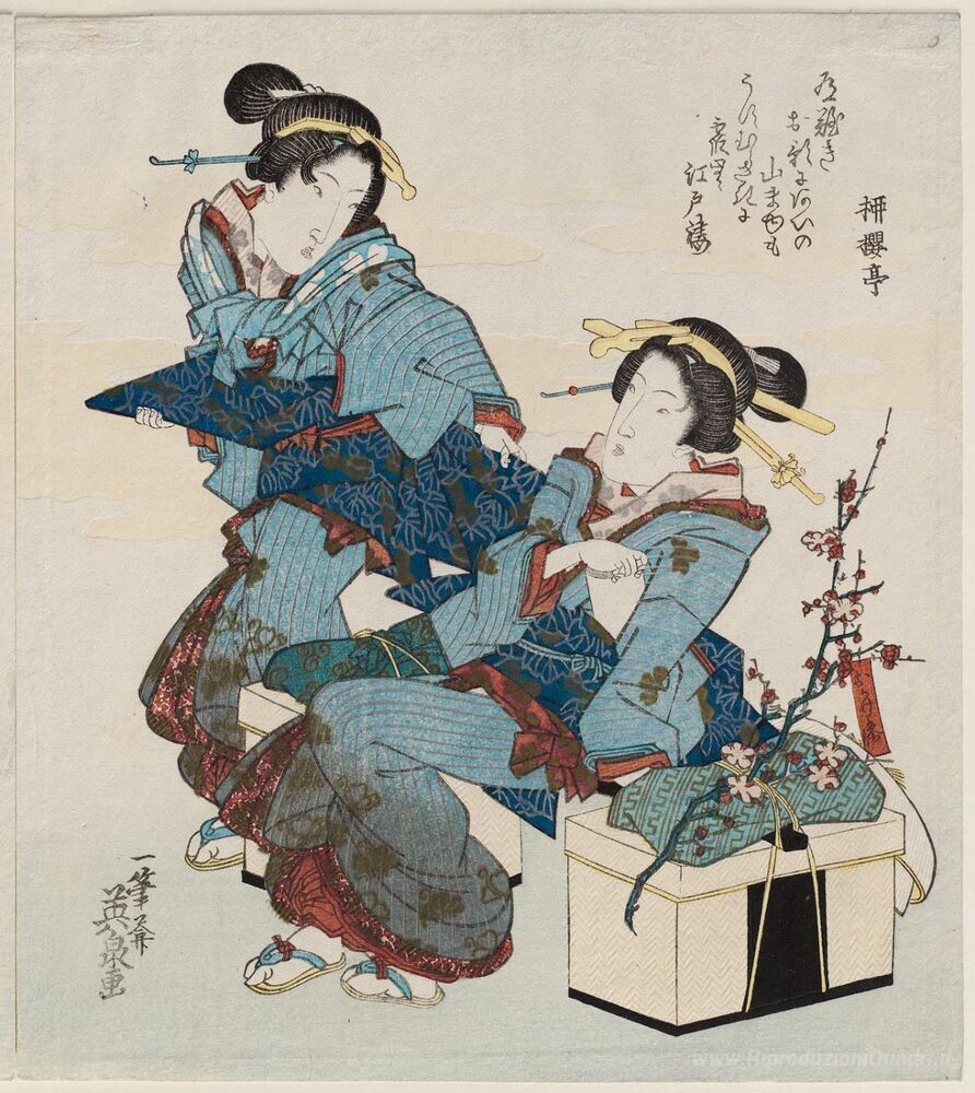 Ti offriamo una riproduzione artigianale su tela dell'opera famosa 'Le donne in gita' di Keisai Eisen, dal Museo delle Riproduzioni.