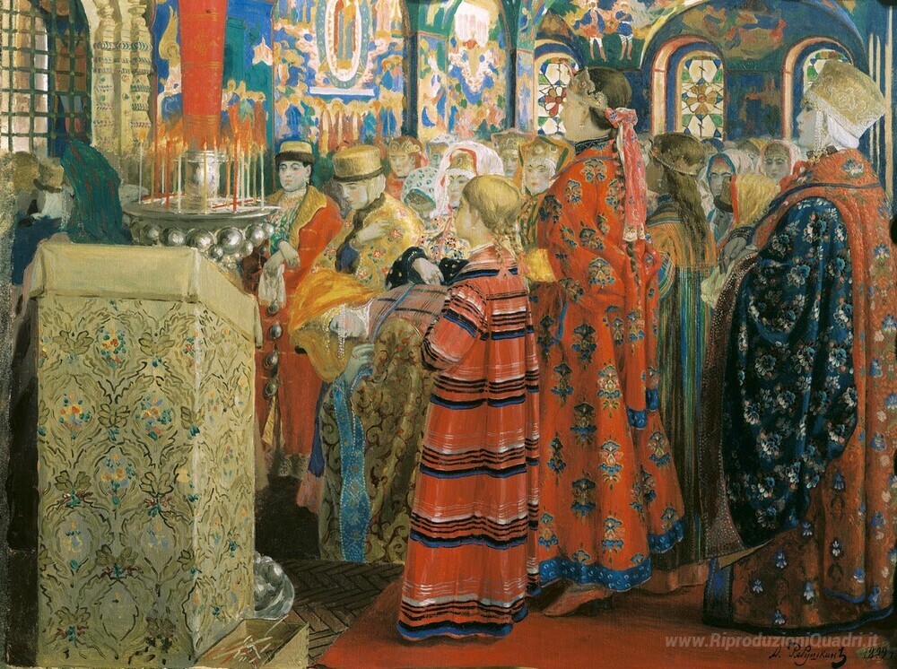 Scopri l'eleganza e la profondità dell'arte di Andrei Ryabushkin, un maestro dell'arte russa noto per la sua abilità nella rappresentazione di scene storiche con un tocco di realismo impressionante. Il suo dipinto, Le donne russe del XVII secolo in Chiesa, cattura l'essenza di un'epoca e di una cultura, esprimendo attraverso dettagli minuziosi e colori vibranti la spiritualità e la bellezza delle figure femminili in un contesto religioso.