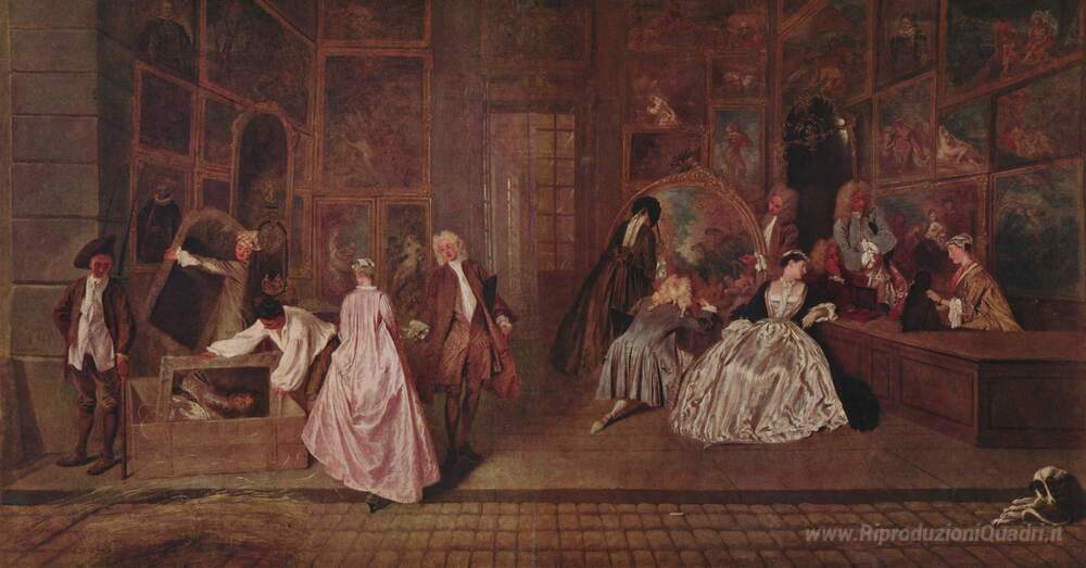 Ti offriamo una riproduzione artigianale su tela dell'opera famosa 'L'Enseigne de Gersaint' di Antoine Watteau, dal Museo delle Riproduzioni.