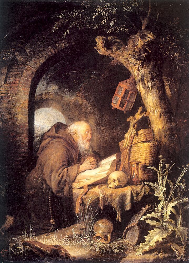 Ti offriamo una riproduzione artigianale su tela dell'opera famosa 'L'Eremita' di Gerrit Dou, dal Museo delle Riproduzioni.
