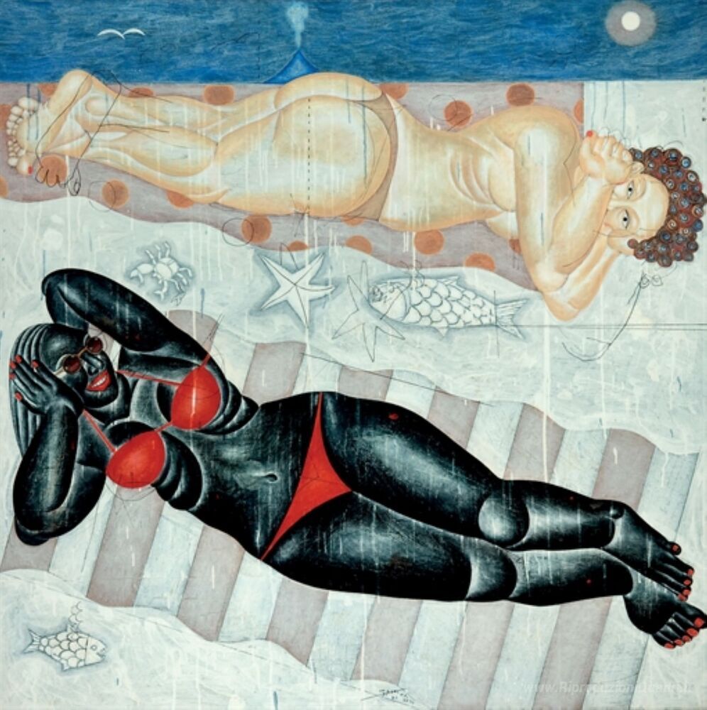 Ti offriamo una riproduzione artigianale su tela dell'opera famosa 'Leyeh-leyeh (Relax)' di Nyoman Masriadi, dal Museo delle Riproduzioni.