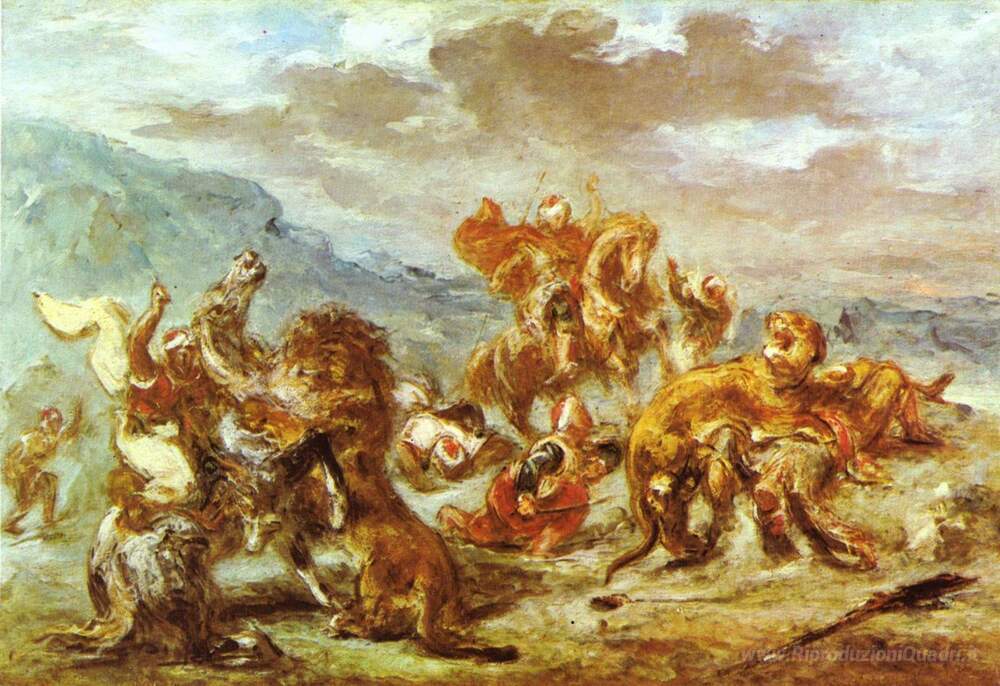 Ti offriamo una riproduzione artigianale su tela dell'opera famosa 'Lion Hunt' di Eugene Delacroix, dal Museo delle Riproduzioni.