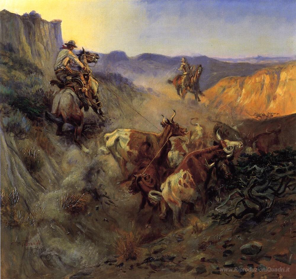 Ti offriamo una riproduzione artigianale su tela dell'opera famosa 'L'orecchio Slick' di Charles M. Russell, dal Museo delle Riproduzioni.