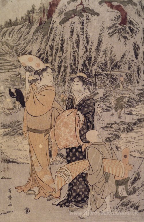 Ti offriamo una riproduzione artigianale su tela dell'opera famosa 'Lungo la riva del Yènoshim' di Kitagawa Utamaro, dal Museo delle Riproduzioni.