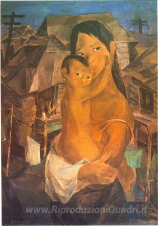 Ti offriamo una riproduzione artigianale su tela dell'opera famosa 'Madonna degli Slums' di Vicente Manansala, dal Museo delle Riproduzioni.