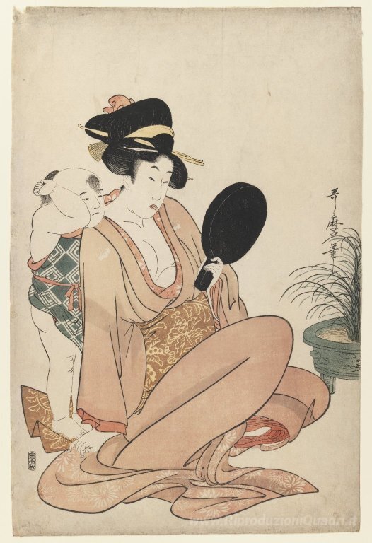 Ti offriamo una riproduzione artigianale su tela dell'opera famosa 'Madre e il Bambino Guardando uno specchio a mano' di Kitagawa Utamaro, dal Museo delle Riproduzioni.