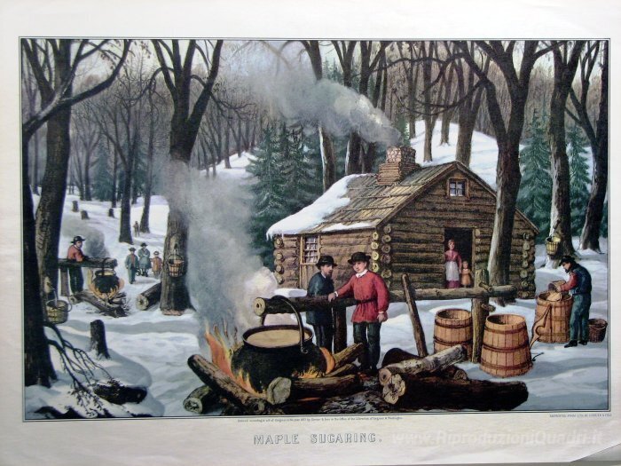 Ti offriamo una riproduzione artigianale su tela dell'opera famosa 'Maple Sugaring' di Currier and Ives, dal Museo delle Riproduzioni.