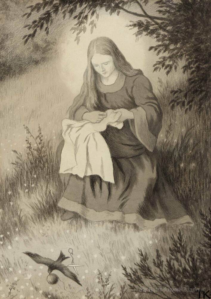 Ti offriamo una riproduzione artigianale su tela dell'opera famosa 'Maria Jomfru Og Svalen' di Theodor Severin Kittelsen, dal Museo delle Riproduzioni.
