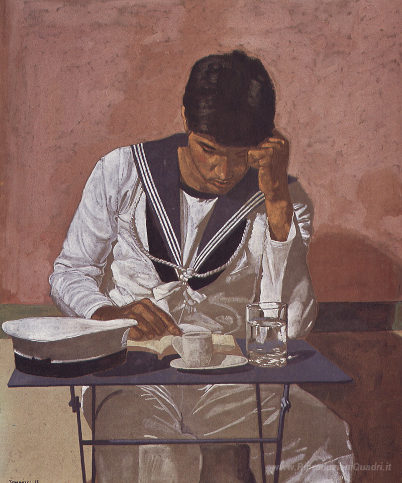 Ti offriamo una riproduzione artigianale su tela dell'opera famosa 'Mariner lettura su sfondo rosa' di Yiannis Tsaroychis, dal Museo delle Riproduzioni.