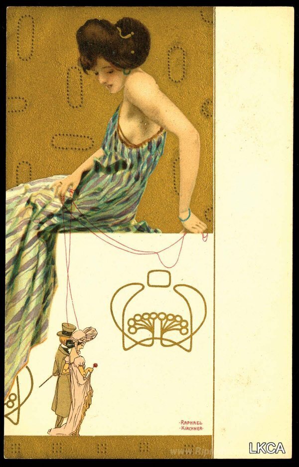 Ti offriamo una riproduzione artigianale su tela dell'opera famosa 'Marionette' di Raphael Kirchner, dal Museo delle Riproduzioni.