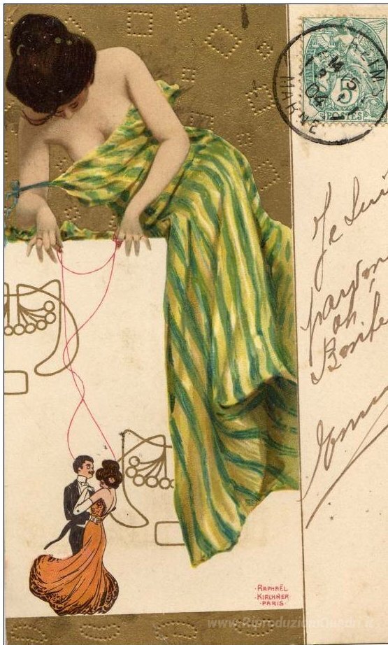 Ti offriamo una riproduzione artigianale su tela dell'opera famosa 'Marionette' di Raphael Kirchner, dal Museo delle Riproduzioni.