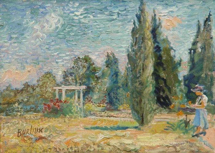 Ti offriamo una riproduzione artigianale su tela dell'opera famosa 'Marusia nel parco' di David Burliuk, dal Museo delle Riproduzioni.