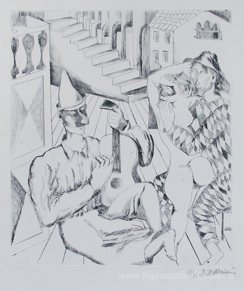 Ti offriamo una riproduzione artigianale su tela dell'opera famosa 'Mascherata' di Ossip Zadkine, dal Museo delle Riproduzioni.
