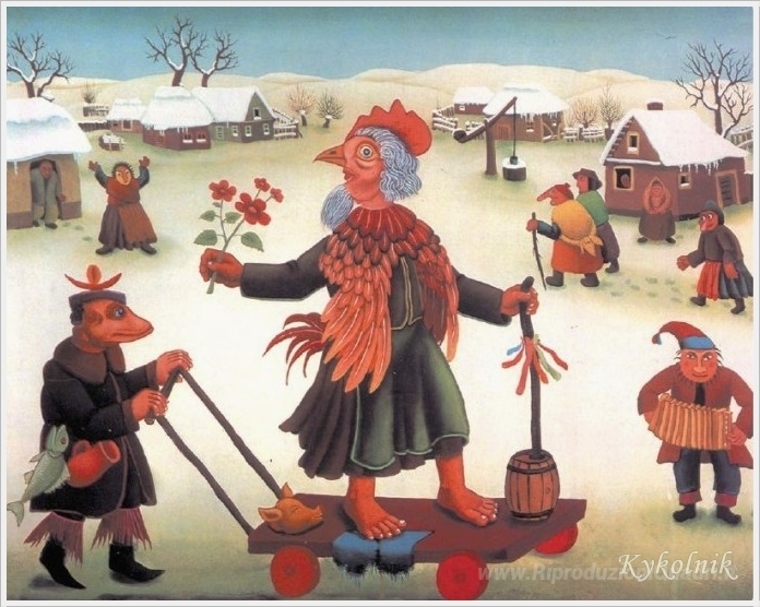 Ti offriamo una riproduzione artigianale su tela dell'opera famosa 'Masquerade in inverno' di Ivan Generalic, dal Museo delle Riproduzioni.