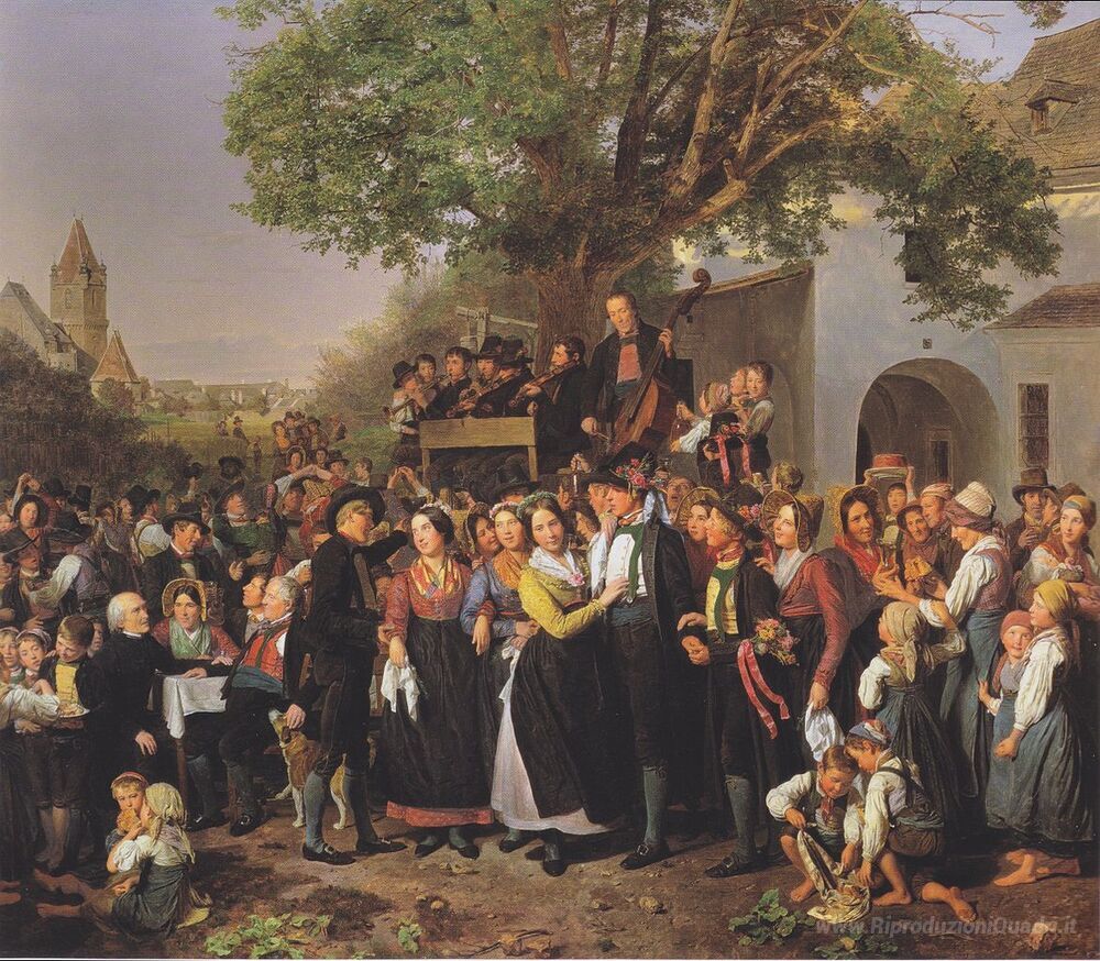 Ti offriamo una riproduzione artigianale su tela dell'opera famosa 'Matrimonio contadino Bassa Austria' di Ferdinand Georg Waldmüller, dal Museo delle Riproduzioni.