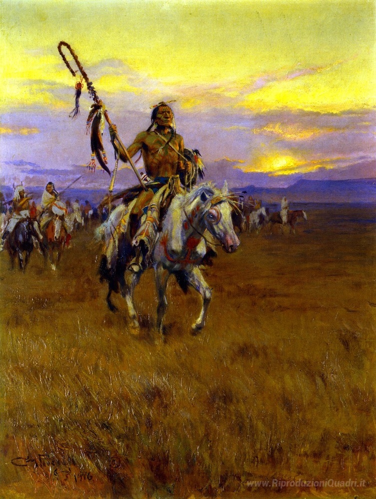 Benvenuti nel nostro mondo di dipinti a olio, dove l’arte italiana incontra la maestria di artisti internazionali. In particolare, vi presentiamo Medicine Man [No. 4] dell'acclamato artista Charles M. Russell. Nato nel 1864, Russell è conosciuto per la sua intensa rappresentazione della vita e delle tradizioni delle popolazioni indiane d'America, un tema che ha permeato profondamente la sua opera.