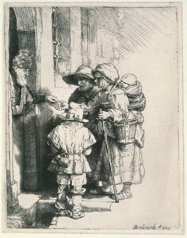 Ti offriamo una riproduzione artigianale su tela dell'opera famosa 'Mendicanti sulla soglia di una casa' di Rembrandt, dal Museo delle Riproduzioni.