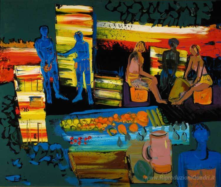 Ti offriamo una riproduzione artigianale su tela dell'opera famosa 'Mercato African Night' di Walter Battiss, dal Museo delle Riproduzioni.