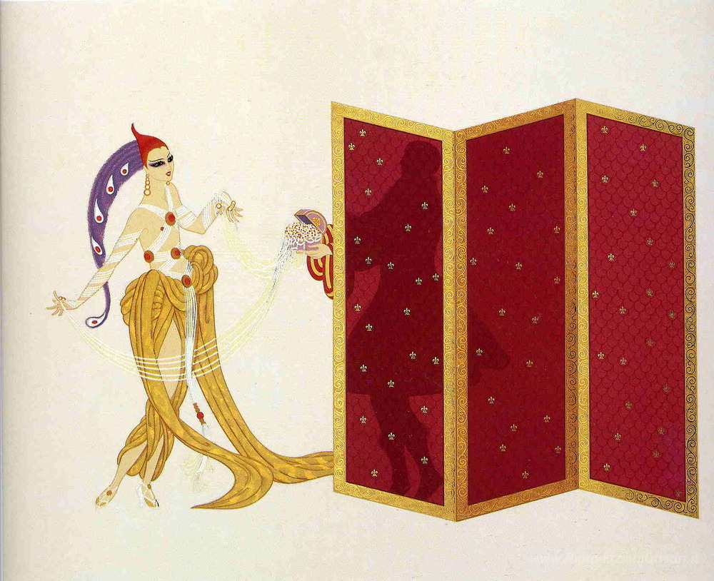 Ti offriamo una riproduzione artigianale su tela dell'opera famosa 'Mistero della cortigiana' di Erte, dal Museo delle Riproduzioni.