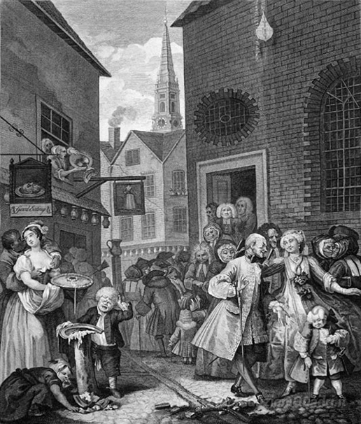 Ti offriamo una riproduzione artigianale su tela dell'opera famosa 'Momenti della giornata, Mezzogiorno' di William Hogarth, dal Museo delle Riproduzioni.