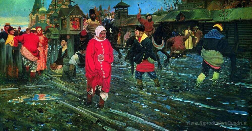 Ti offriamo una riproduzione artigianale su tela dell'opera famosa 'Mosca Via del XVII secolo' di Andrei Ryabushkin, dal Museo delle Riproduzioni.