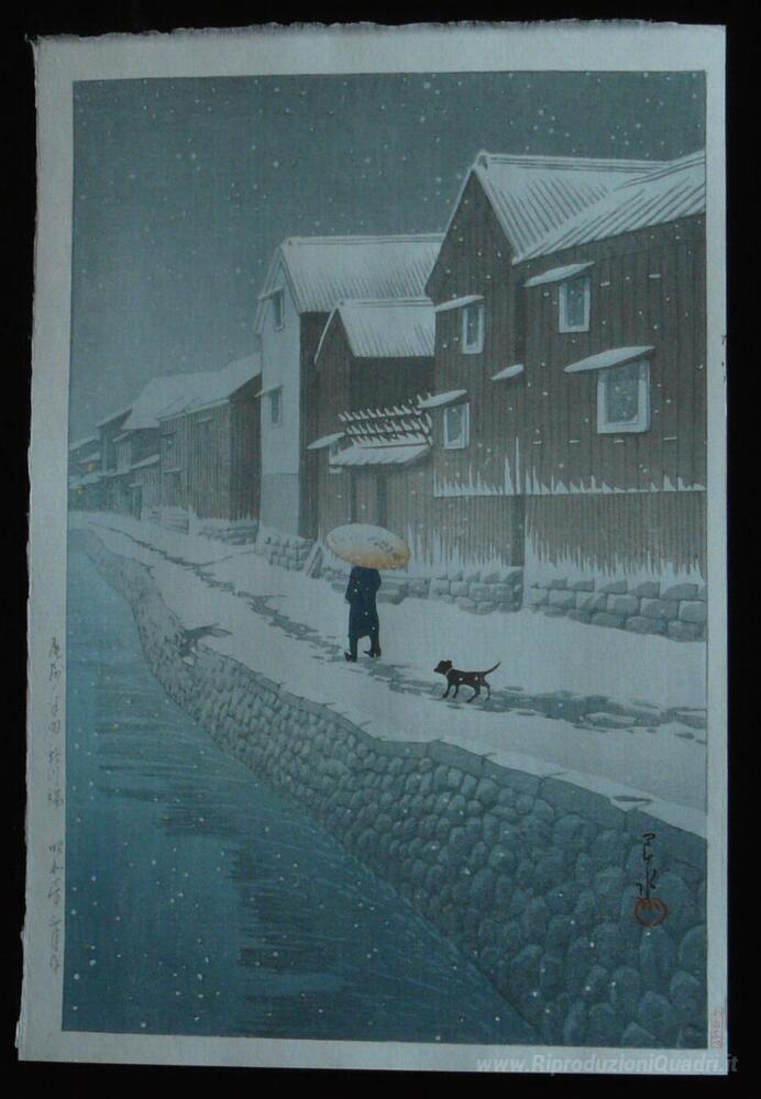 Ti offriamo una riproduzione artigianale su tela dell'opera famosa 'Mostra a Shinkawabata' di Hasui Kawase, dal Museo delle Riproduzioni.