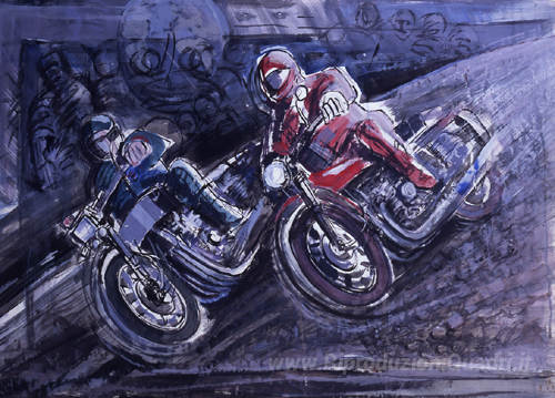 Ti offriamo una riproduzione artigianale su tela dell'opera famosa 'Motor Cycle Race' di Gebre Kristos Desta, dal Museo delle Riproduzioni.