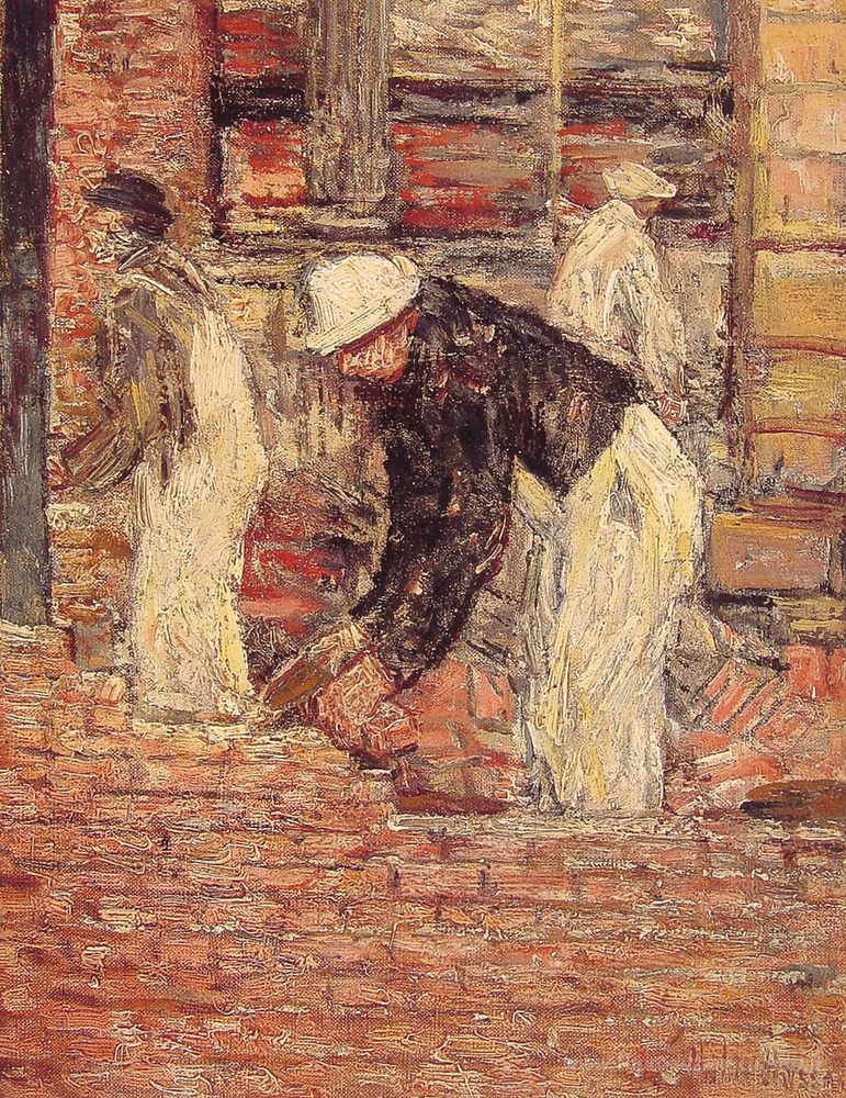 Ti offriamo una riproduzione artigianale su tela dell'opera famosa 'Muratori' di Childe Hassam, dal Museo delle Riproduzioni.
