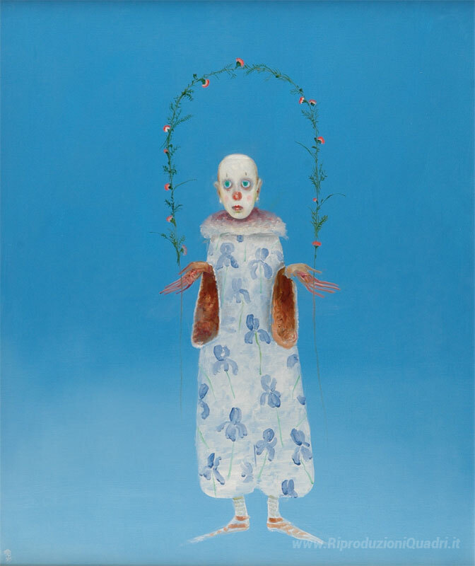 Ti offriamo una riproduzione artigianale su tela dell'opera famosa 'Nano con i fiori rossi' di Stefan Caltia, dal Museo delle Riproduzioni.