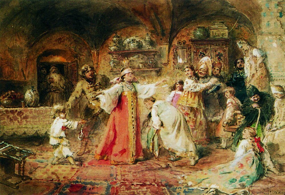 Ti offriamo una riproduzione artigianale su tela dell'opera famosa 'Nascondino' di Konstantin Makovsky, dal Museo delle Riproduzioni.