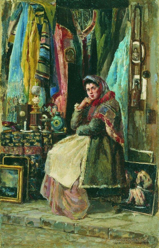 Ti offriamo una riproduzione artigianale su tela dell'opera famosa 'Negozio di antiquariato' di Konstantin Makovsky, dal Museo delle Riproduzioni.
