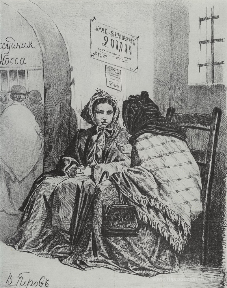 Ti offriamo una riproduzione artigianale su tela dell'opera famosa 'Nel Monte di Pietà' di Vasily Perov, dal Museo delle Riproduzioni.