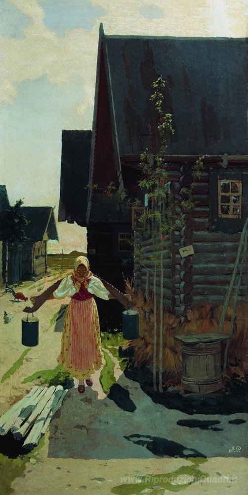 Ti offriamo una riproduzione artigianale su tela dell'opera famosa 'Nel villaggio. Ragazza con un secchio' di Andrei Ryabushkin, dal Museo delle Riproduzioni.