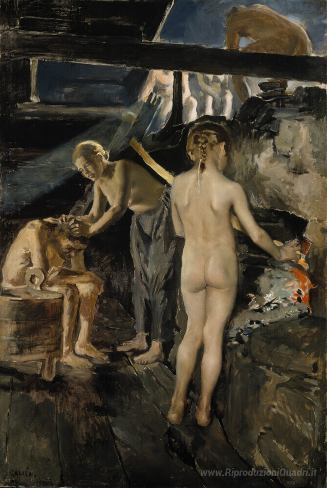 Ti offriamo una riproduzione artigianale su tela dell'opera famosa 'Nella sauna' di Akseli Gallen-Kallela, dal Museo delle Riproduzioni.