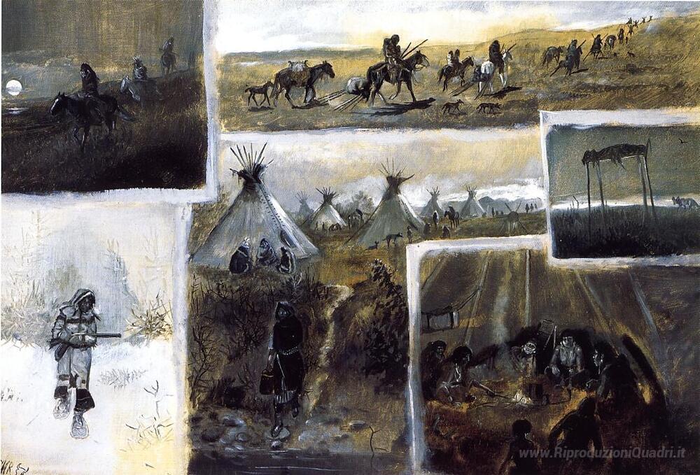 Ti offriamo una riproduzione artigianale su tela dell'opera famosa 'Occidentale Montage' di Charles M. Russell, dal Museo delle Riproduzioni.