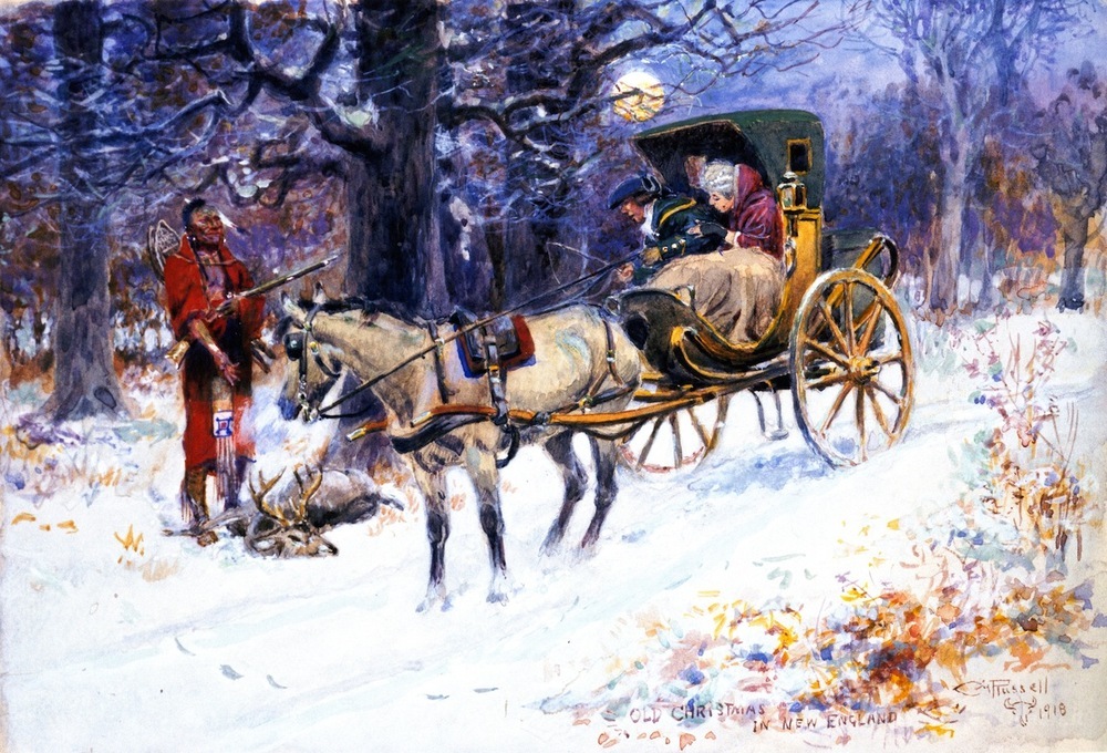 Ti offriamo una riproduzione artigianale su tela dell'opera famosa 'Old Christmas in New England' di Charles M. Russell, dal Museo delle Riproduzioni.