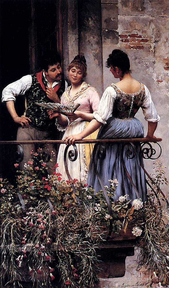Ti offriamo una riproduzione artigianale su tela dell'opera famosa 'On The Balcony' di Eugene de Blaas, dal Museo delle Riproduzioni.