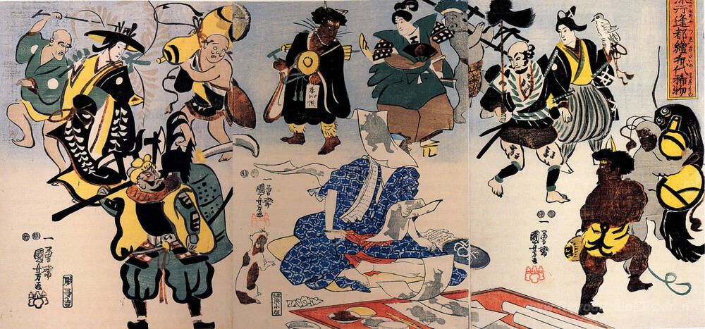 Ti offriamo una riproduzione artigianale su tela dell'opera famosa 'Otsu-e dipinti provenienti Alive Trittico' di Utagawa Kuniyoshi, dal Museo delle Riproduzioni.