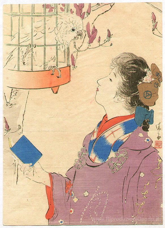 Ti offriamo una riproduzione artigianale su tela dell'opera famosa 'Parlando con Parrot' di Kiyokata Kaburagi, dal Museo delle Riproduzioni.