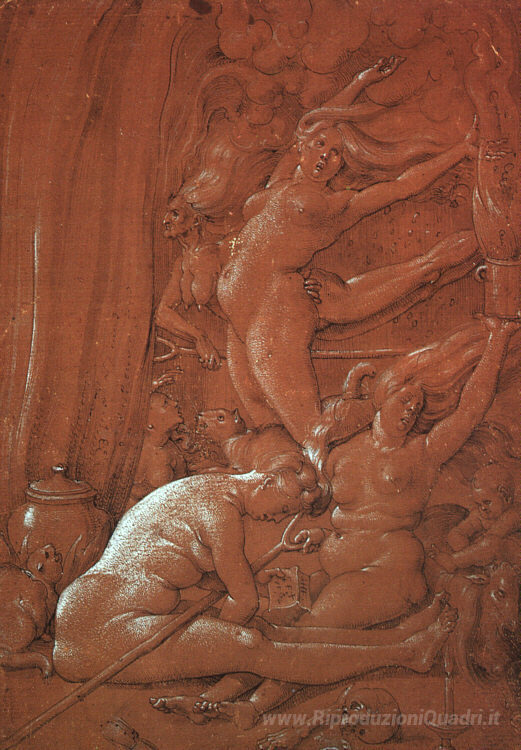 Ti offriamo una riproduzione artigianale su tela dell'opera famosa 'Partenza per il sabato' di Hans Baldung, dal Museo delle Riproduzioni.