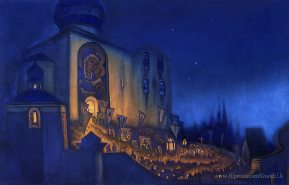 Ti offriamo una riproduzione artigianale su tela dell'opera famosa 'Pasqua russa' di Nicholas Roerich, dal Museo delle Riproduzioni.