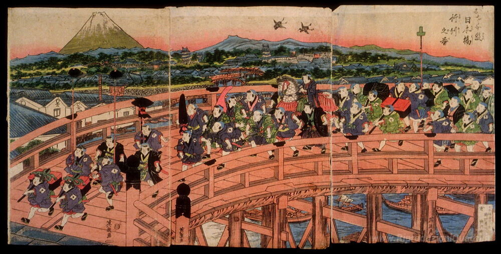 Ti offriamo una riproduzione artigianale su tela dell'opera famosa 'Passatempi bambini: una processione sul ponte Nihon' di Keisai Eisen, dal Museo delle Riproduzioni.