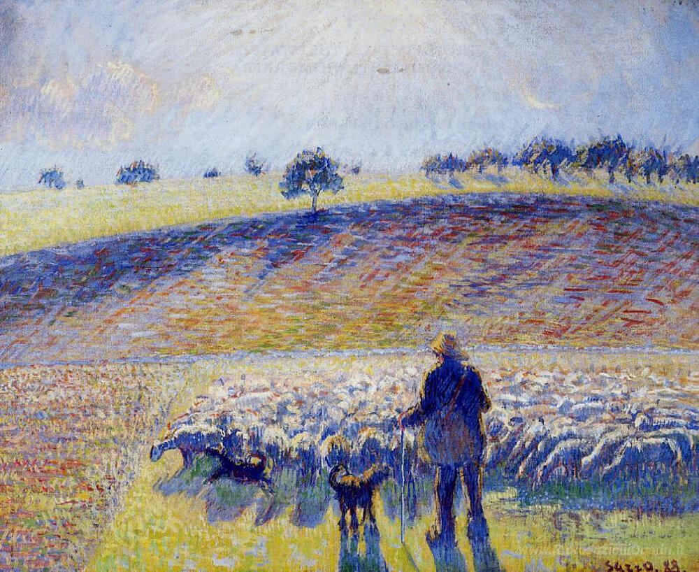 Ti offriamo una riproduzione artigianale su tela dell'opera famosa 'Pastore e pecore' di Camille Pissarro, dal Museo delle Riproduzioni.