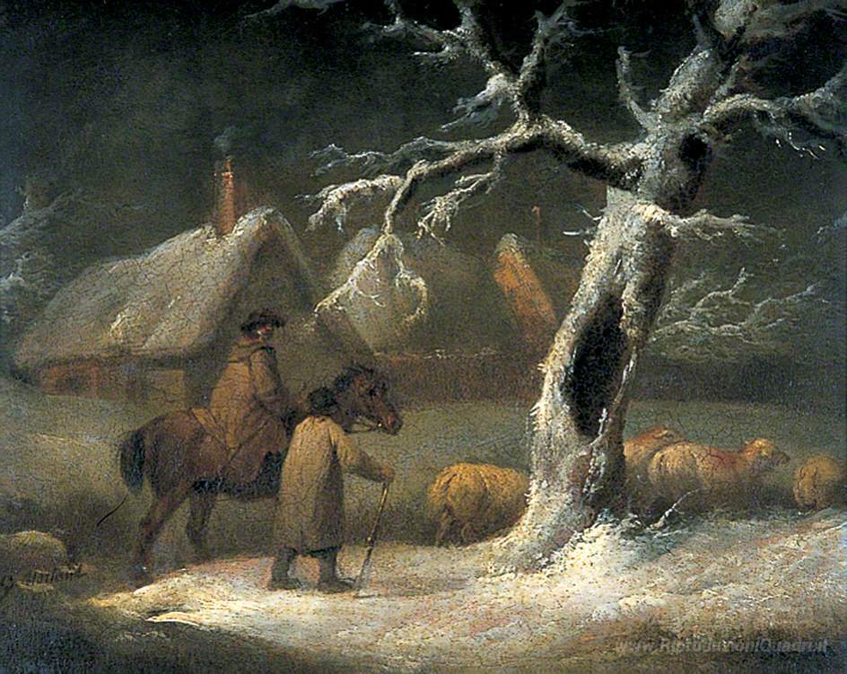 Ti offriamo una riproduzione artigianale su tela dell'opera famosa 'Pastore in un paesaggio innevato' di George Morland, dal Museo delle Riproduzioni.