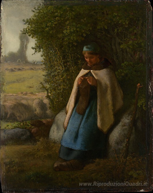 Ti offriamo una riproduzione artigianale su tela dell'opera famosa 'Pastorella Seduti su una roccia' di Jean-Francois Millet, dal Museo delle Riproduzioni.