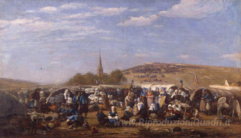 Ti offriamo una riproduzione artigianale su tela dell'opera famosa 'Perdono nella cappella di S. Anna a Palud Plonévez Porzay (Finis' di Eugene Boudin, dal Museo delle Riproduzioni.